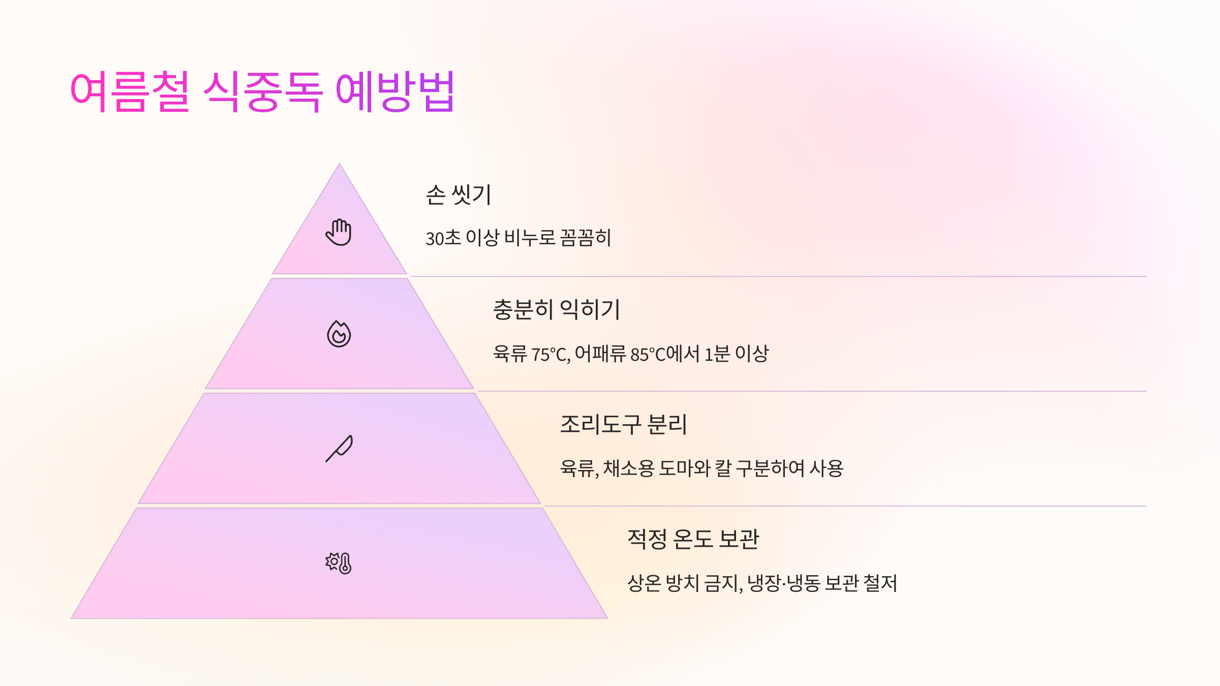 여름철에는 기온과 습도가 높아 세균이 쉽게 번식하기 때문에 식중독 발생 위험이 매우 커요. 😨 식중독은 위장염, 설사, 구토 등을 유발할 수 있어 특히 주의가 필요해요.