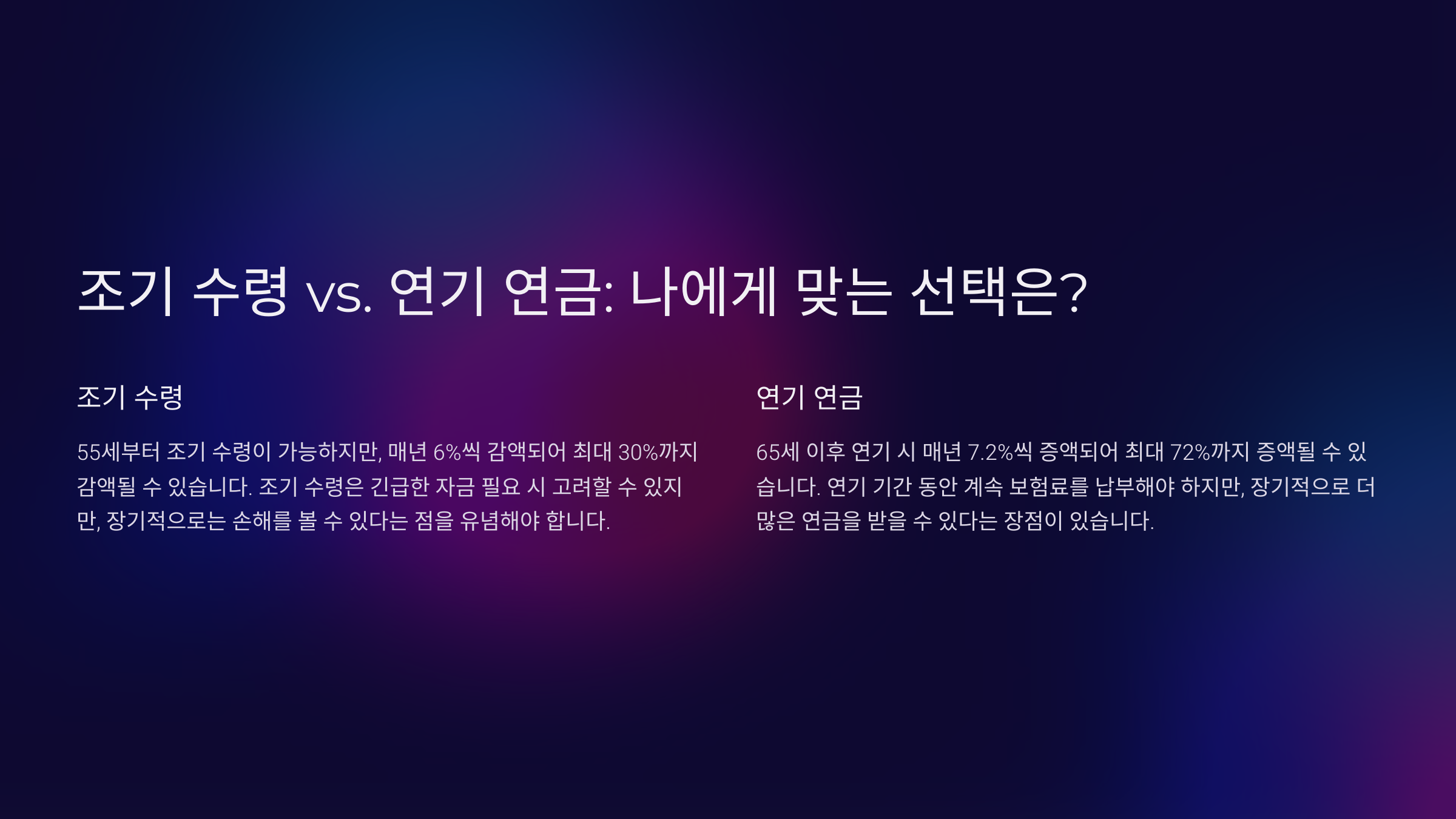 연금을 빨리 받을지, 늦게 받을지는 개인의 상황에 따라 다르게 결정돼요. 조기 수령을 하면 경제적 부담을 줄일 수 있지만 감액이 발생하고, 연기하면 더 많은 연금을 받을 수 있지만 그만큼 기다려야 해요.