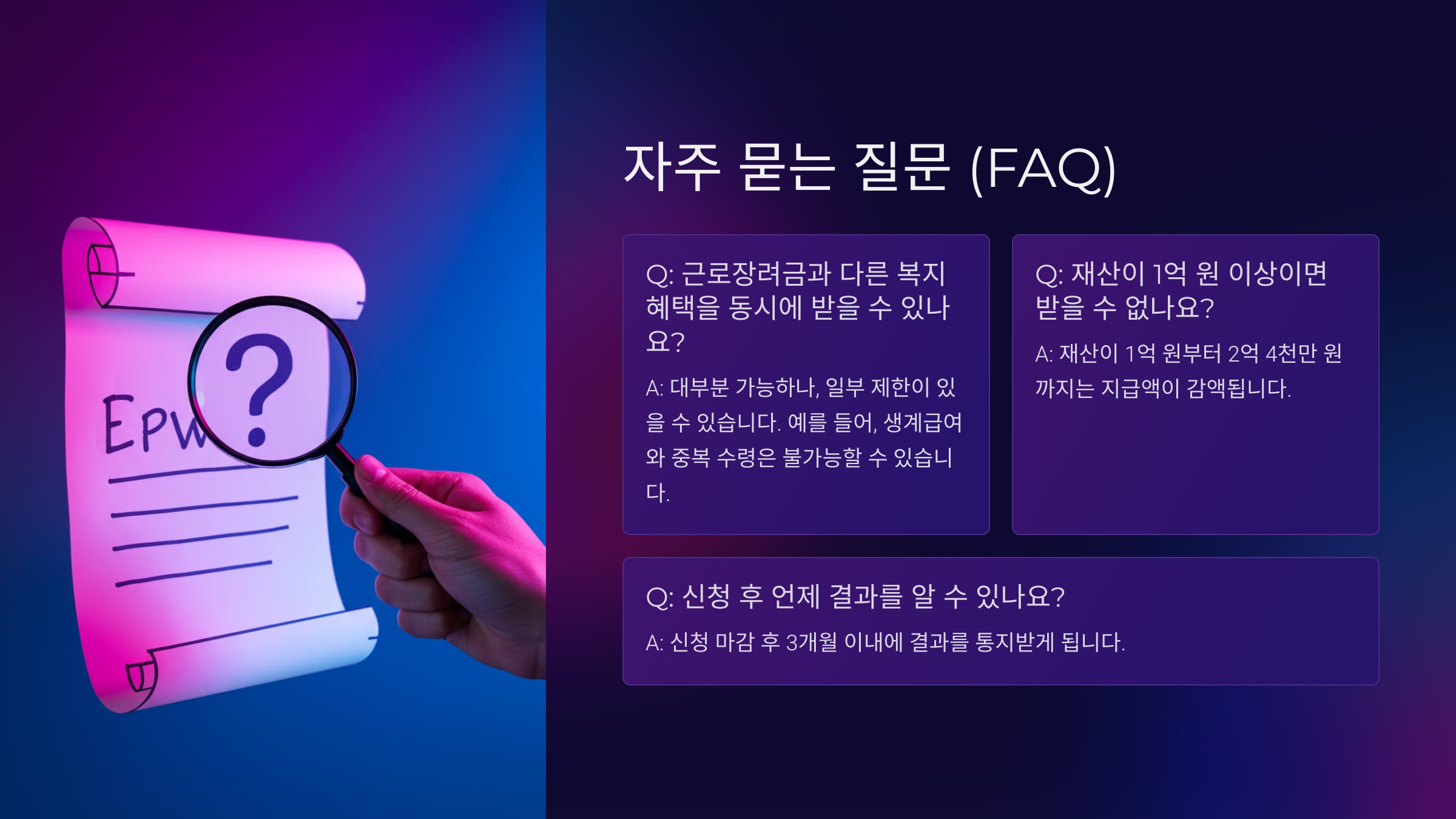 신청 후 국세청의 심사 과정을 거쳐야 하므로, 소득과 재산을 미리 확인하고 신청하는 것이 좋아요. 다음 섹션에서는 자주 묻는 질문(FAQ)을 정리해 볼게요.