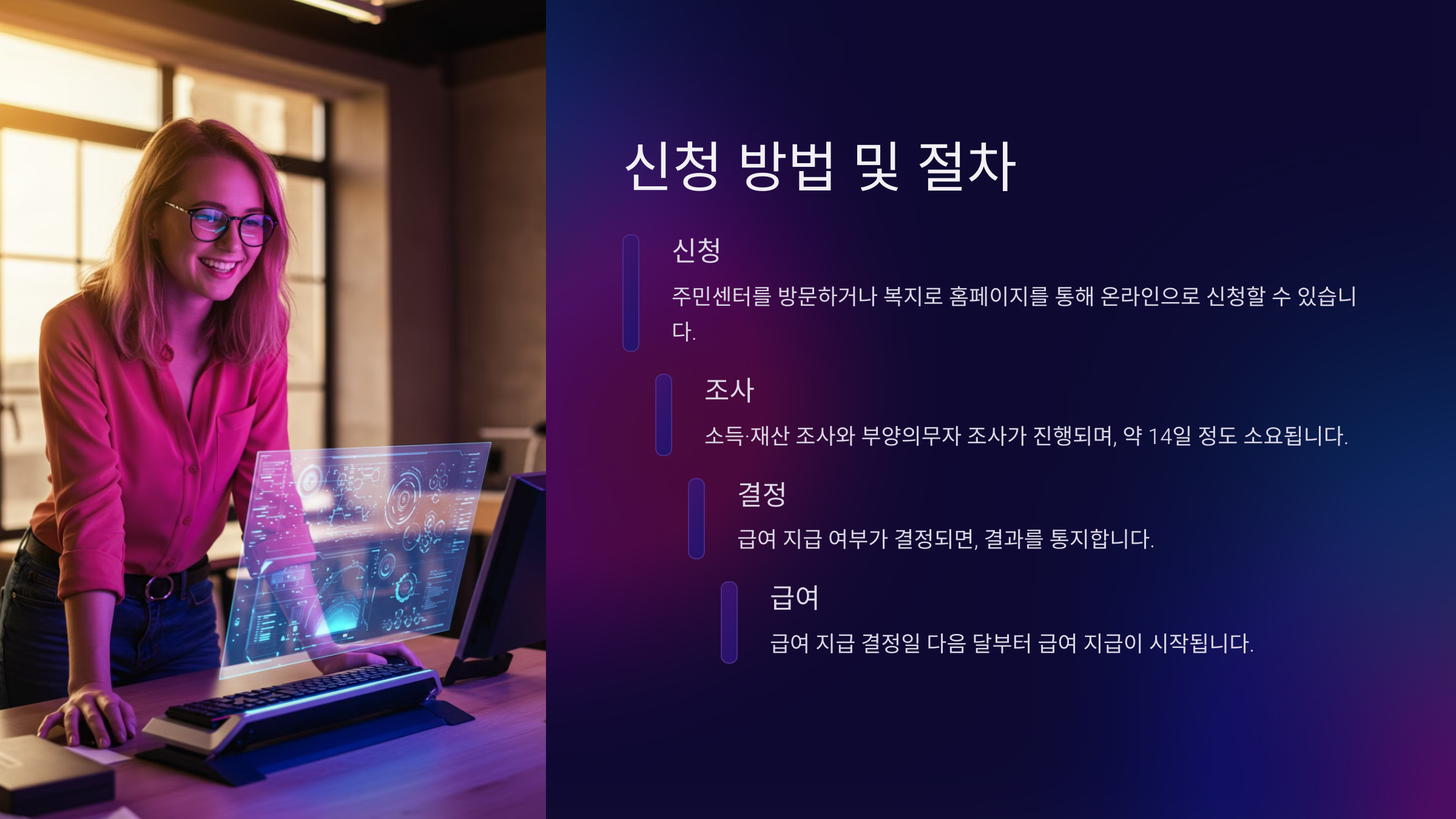 기초생활수급자는 자동으로 선정되지 않기 때문에, 반드시 직접 신청해야 해요. 신청 후 소득과 재산 조사를 거쳐 수급자로 선정되면 급여를 받을 수 있어요.
