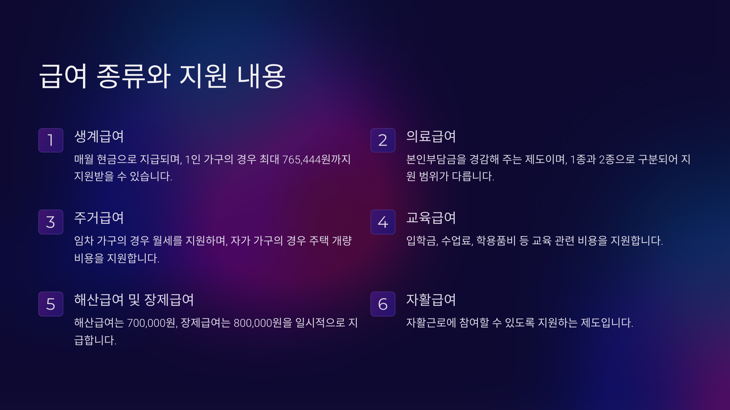 | 생계급여 | 최소한의 생활을 위한 현금 지원 |