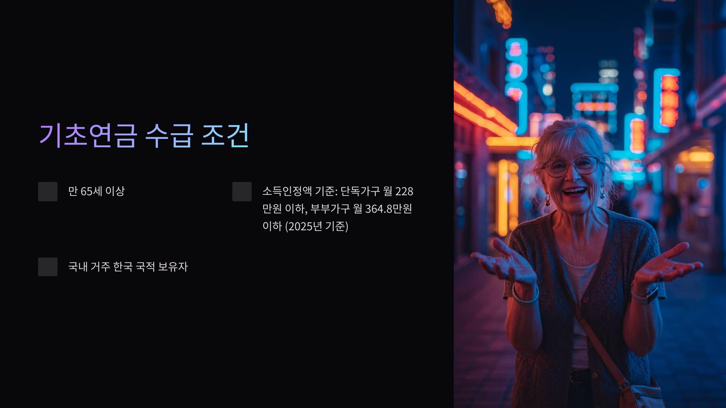 기초연금을 받기 위해서는 일정한 조건을 충족해야 해요. 단순히 만 65세 이상이면 지급되는 것이 아니라, 소득·재산 기준을 충족해야 하고, 본인의 생활 여건에 따라 지급 금액이 달라질 수 있어요.