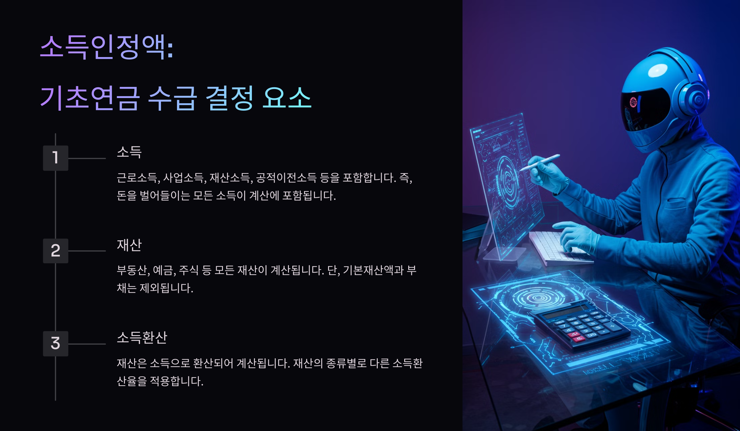 소득인정액은 근로소득, 연금소득, 재산 환산액 등을 합산해 계산돼요. 소득인정액이 기준을 초과하면 기초연금을 받을 수 없거나 감액될 수 있어요.