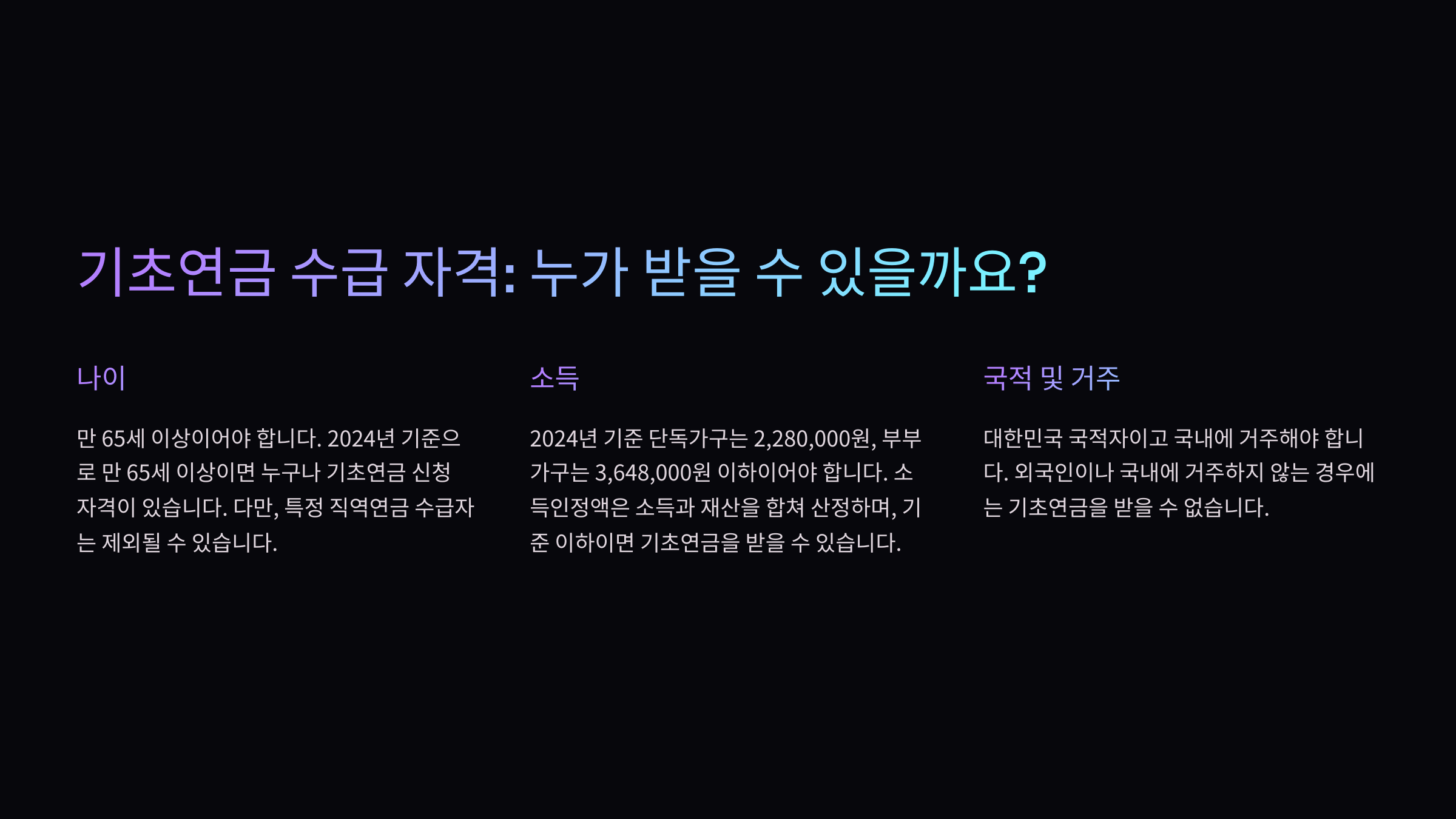 기초연금을 받기 위해서는 일정한 요건을 충족해야 해요. 가장 중요한 기준은 연령, 거주 요건, 소득인정액 세 가지예요.