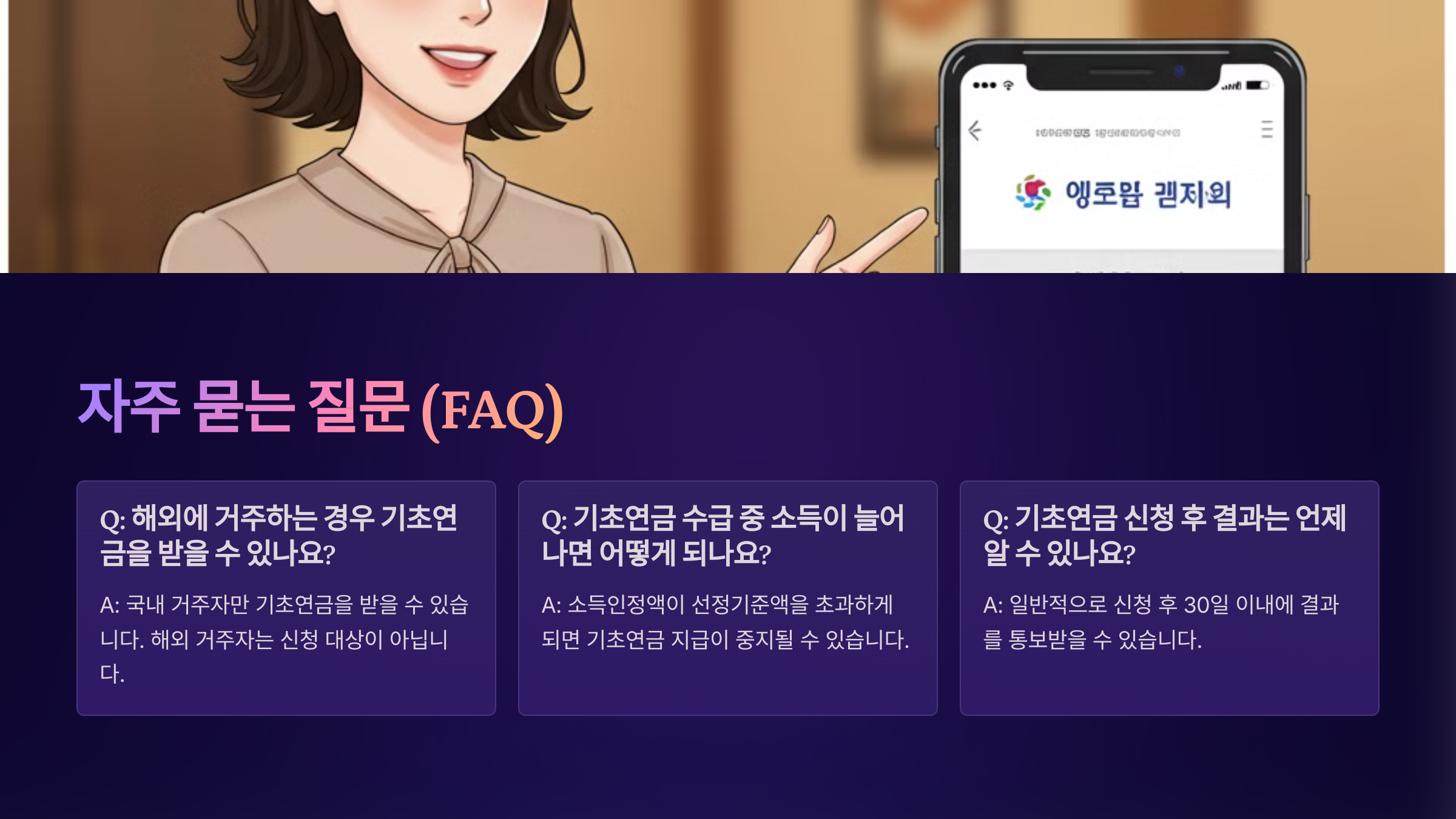 결론적으로, 기초연금을 신청하려면 연령, 소득, 거주 요건을 충족해야 해요. 특히 소득인정액이 중요한 기준이므로 신청 전에 미리 확인하는 것이 좋아요.