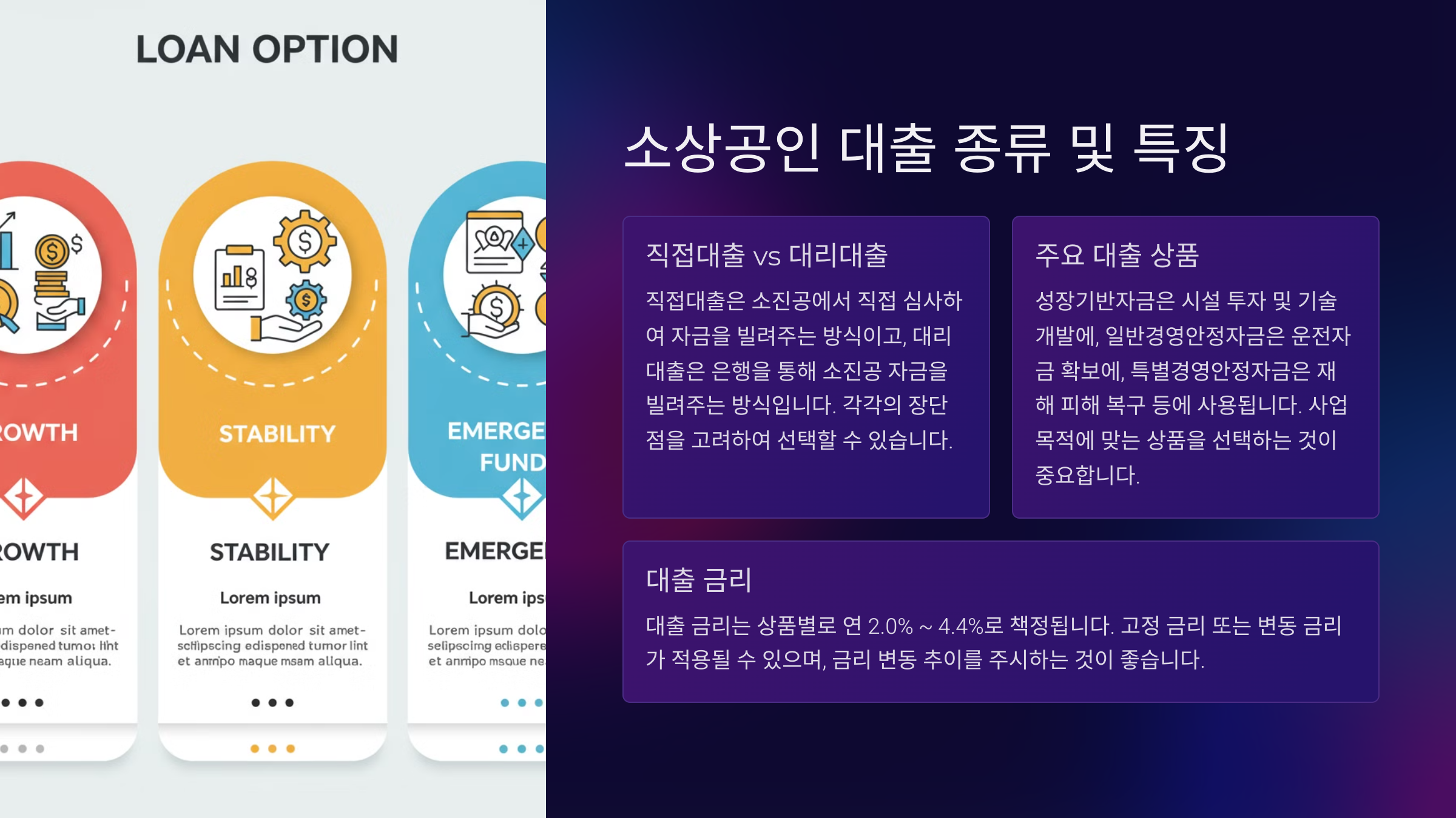 - 다양한 용도 활용: 창업, 운영, 시설, 긴급 자금 등 용도에 맞는 대출 선택 가능