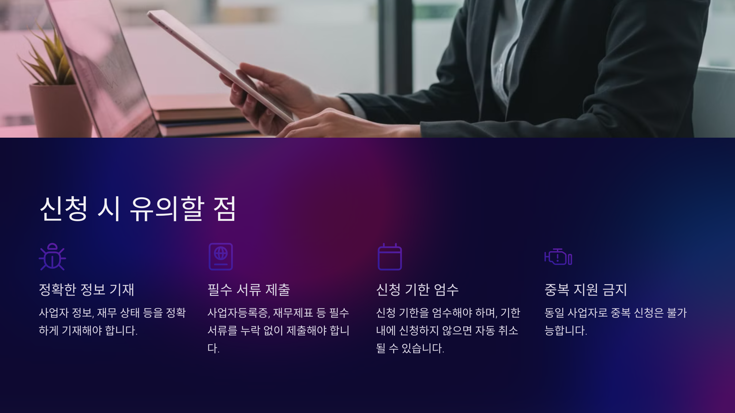 - 자격 심사 – 연 매출, 사업 유형, 기존 지원 내역 확인