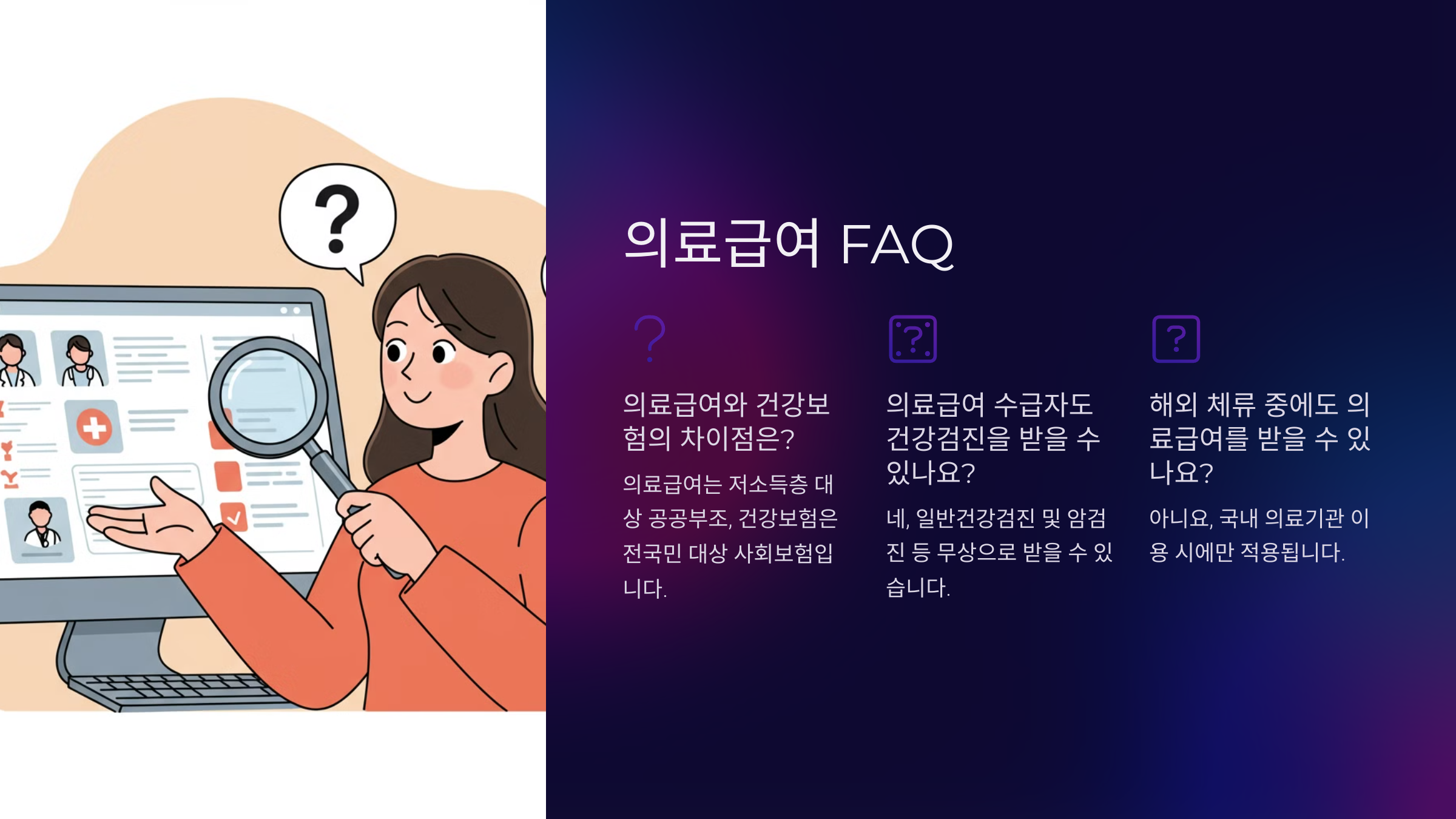 A8. 앞으로는 지원 대상 확대, 본인 부담금 경감, 디지털 의료급여 카드 도입 등의 변화가 예상돼요. 정부는 의료 사각지대를 줄이기 위해 지속적으로 제도를 개선할 계획이에요.