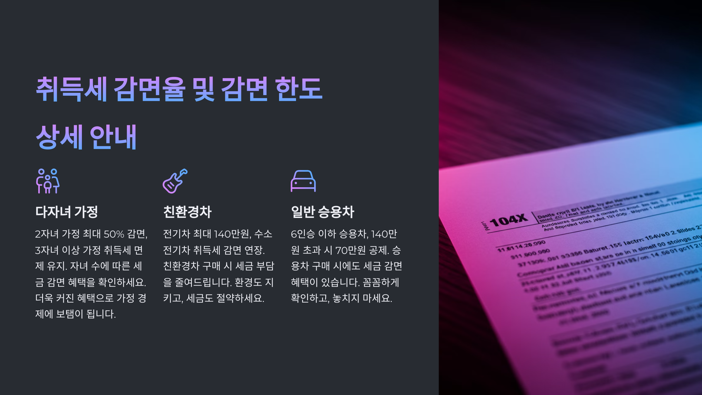 📌 장애인, 국가유공자, 다자녀 가정의 감면 혜택은 유지될 가능성이 높지만, 일부 조정될 수 있어요. 특히 지역별 감면 혜택이 다를 수 있기 때문에 구매 전에 확인이 필요해요.