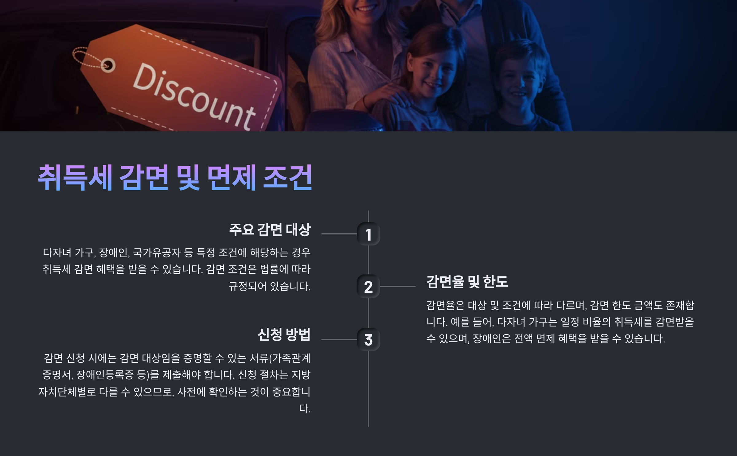 | 다자녀 가정 차량 | 50% 감면 | 3자녀 이상 |