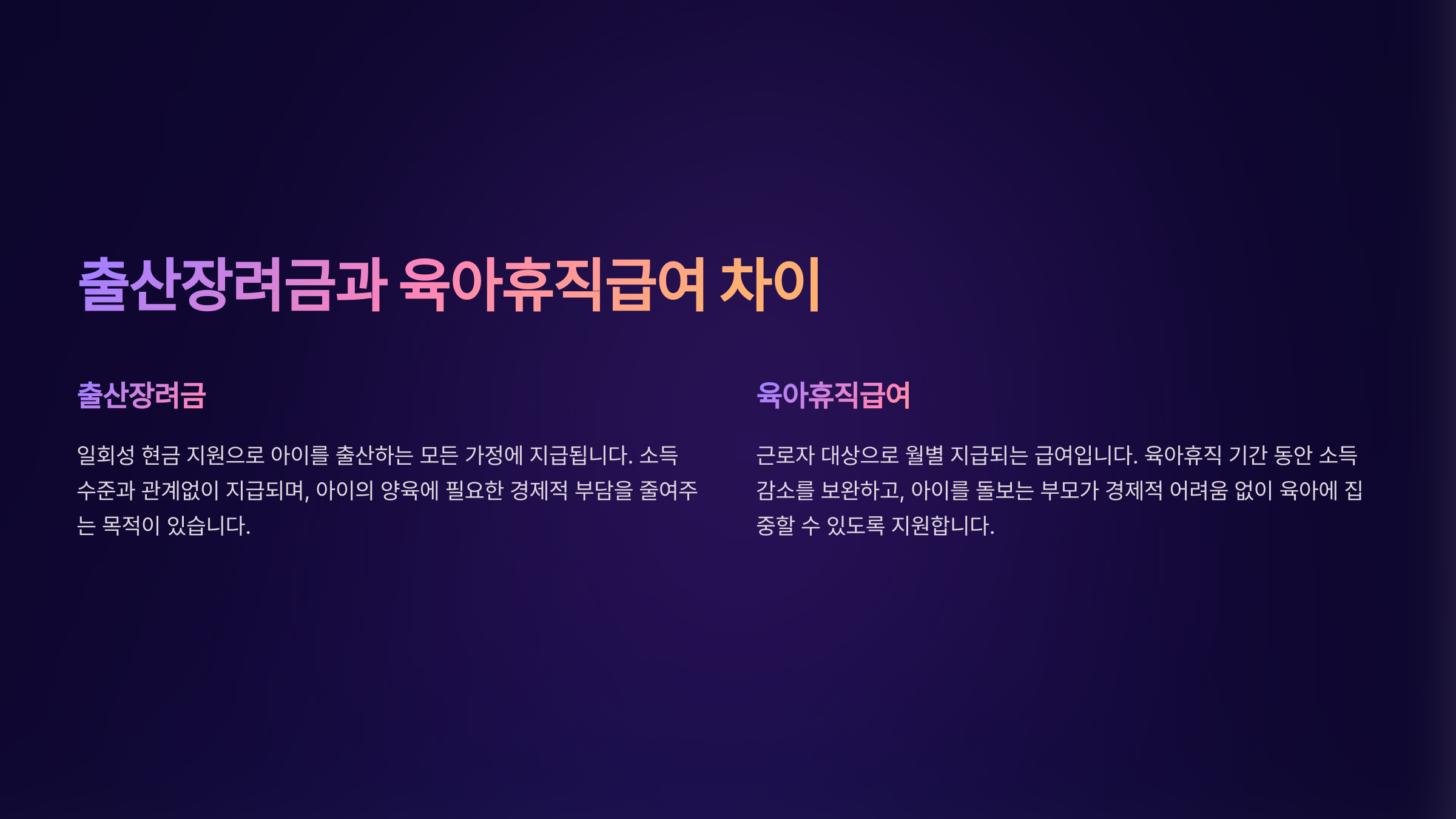 | 지원 목적 | 출산 가정 경제적 지원 | 육아를 위한 소득 보전 |