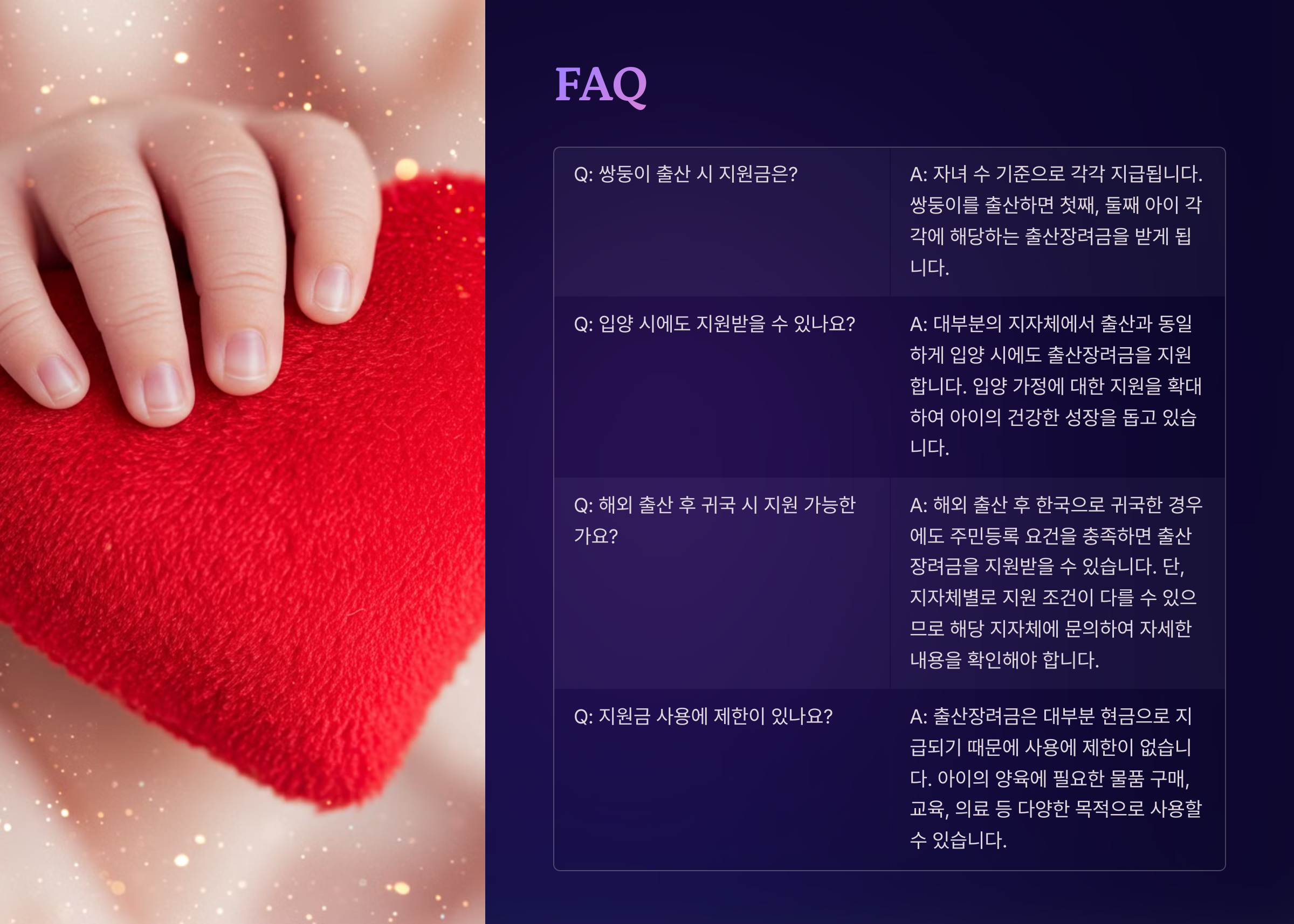 이제 출산장려금 신청과 관련된 자주 묻는 질문(FAQ)을 확인해볼까요? 😊