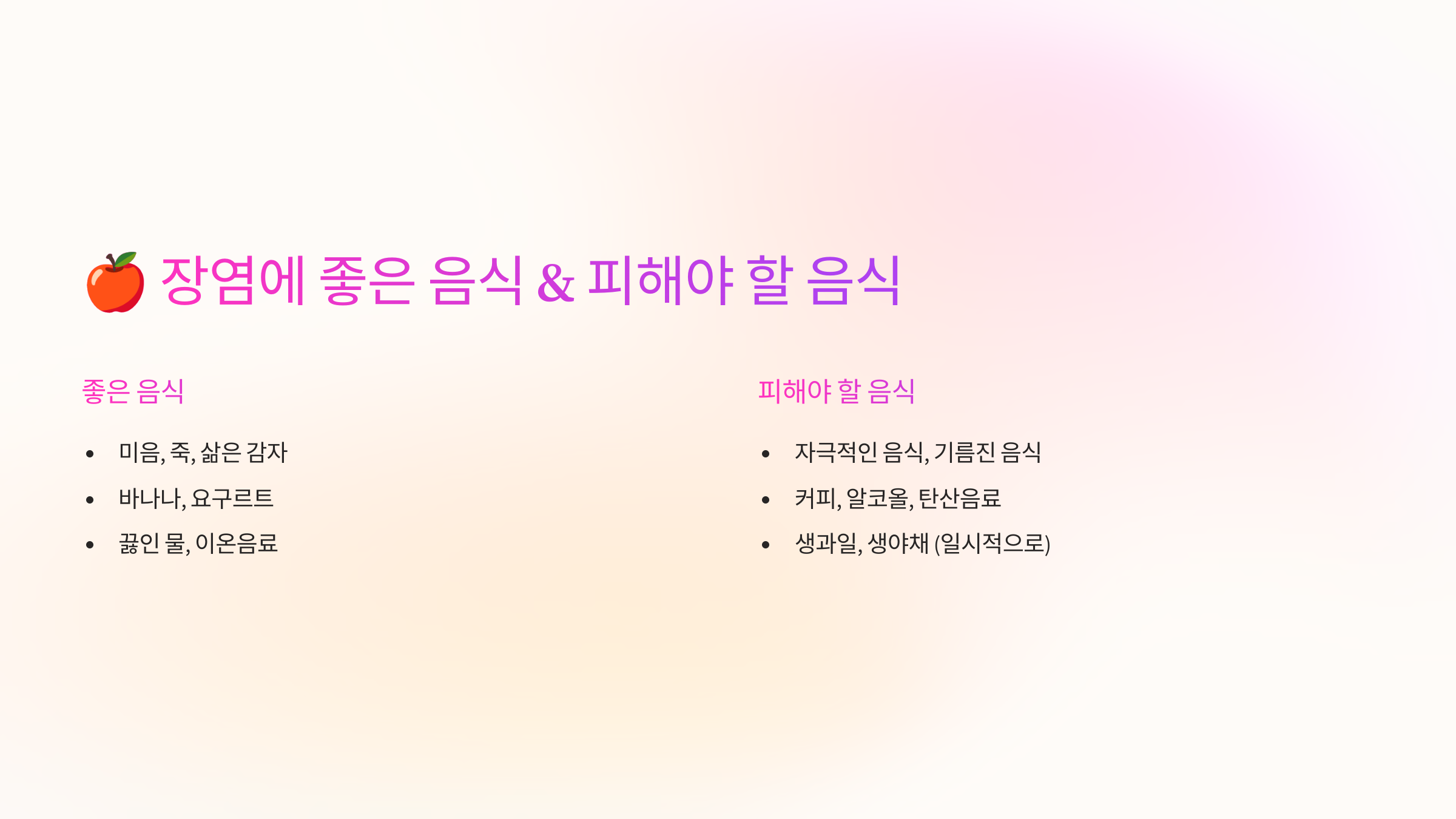 다음 섹션에서는 장염에 좋은 음식과 피해야 할 음식을 정리해볼게요! 🍎