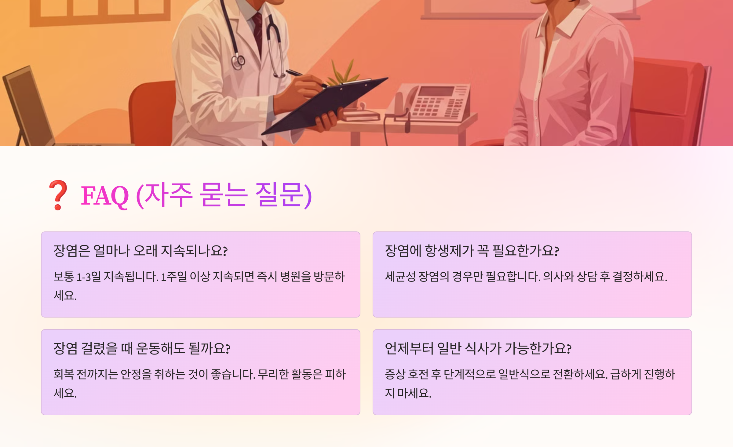 다음 섹션에서는 장염 치료법과 회복을 돕는 생활습관을 알아볼게요! 💊