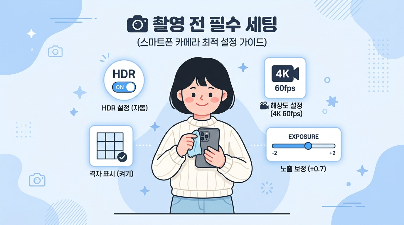 프롬프트: Same cute Korean-style flat illustration character (round face, short black hair, white sweater) holding a smartphone and wiping the lens with a cloth. Around the character, floating icons show HDR toggle, grid lines, exposure slider (+0.7), and resolution settings. Infographic style, soft blue and white color palette, Korean text overlay reading "촬영 전 필수 세팅". Clean layout, minimal design.