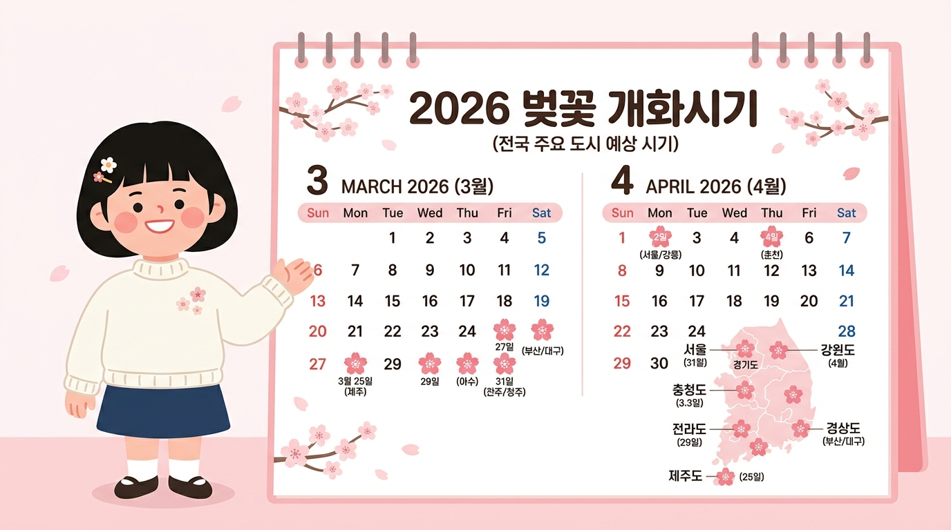 프롬프트: A cute Korean-style flat illustration character (round face, short black hair, white sweater) standing next to a large pastel calendar showing March and April 2026 with cherry blossom icons marking bloom dates on the map of South Korea. Infographic style, soft pink and white color palette, Korean text overlay reading "2026 벚꽃 개화시기". Clean layout, no background clutter, minimal design.