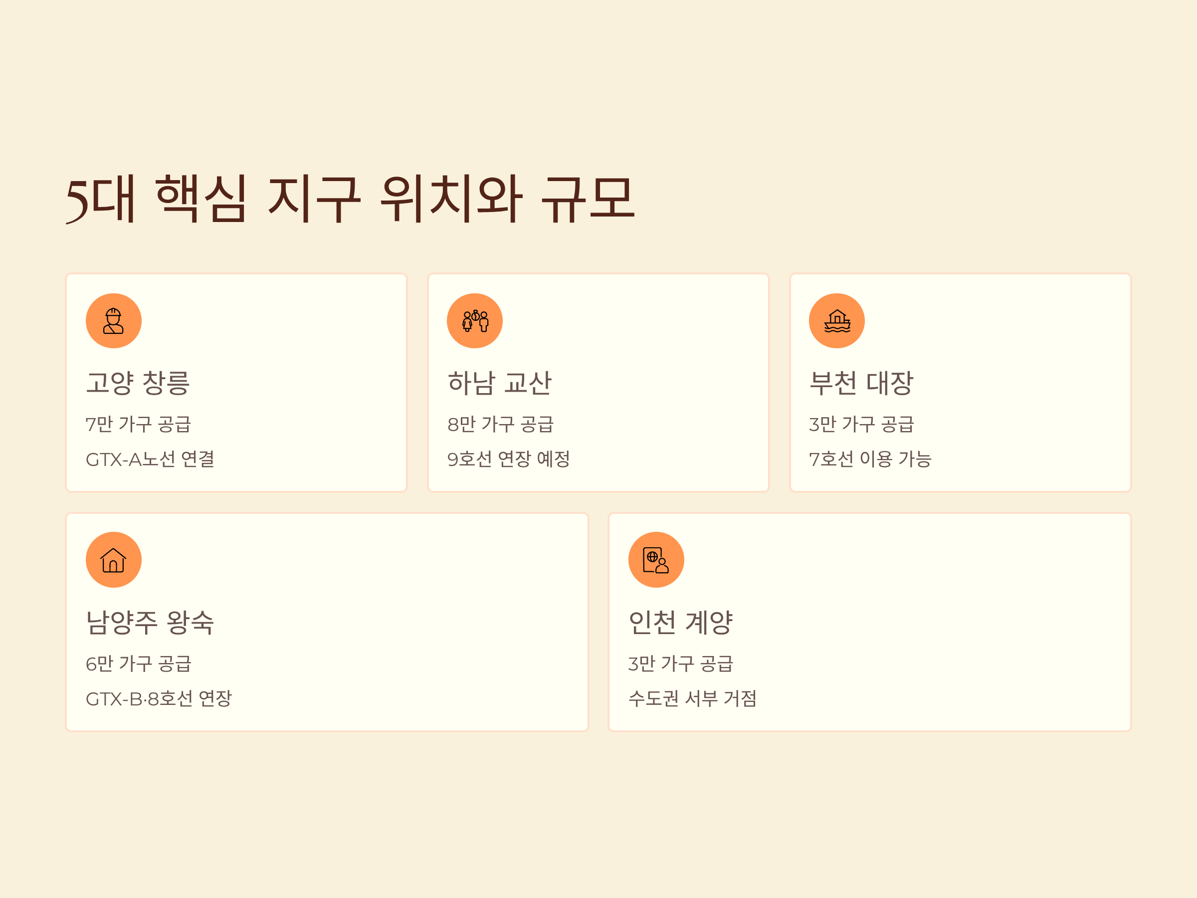 3기신도시는 고양 창릉(7만 가구), 하남 교산(8만 가구), 부천 대장(3만 가구), 남양주 왕숙(6만 가구), 인천 계양(3만 가구) 총 5곳에서 진행됩니다. 모두 수도권 광역 교통망과 연계되어 접근성이 뛰어난 입지를 자랑합니다.