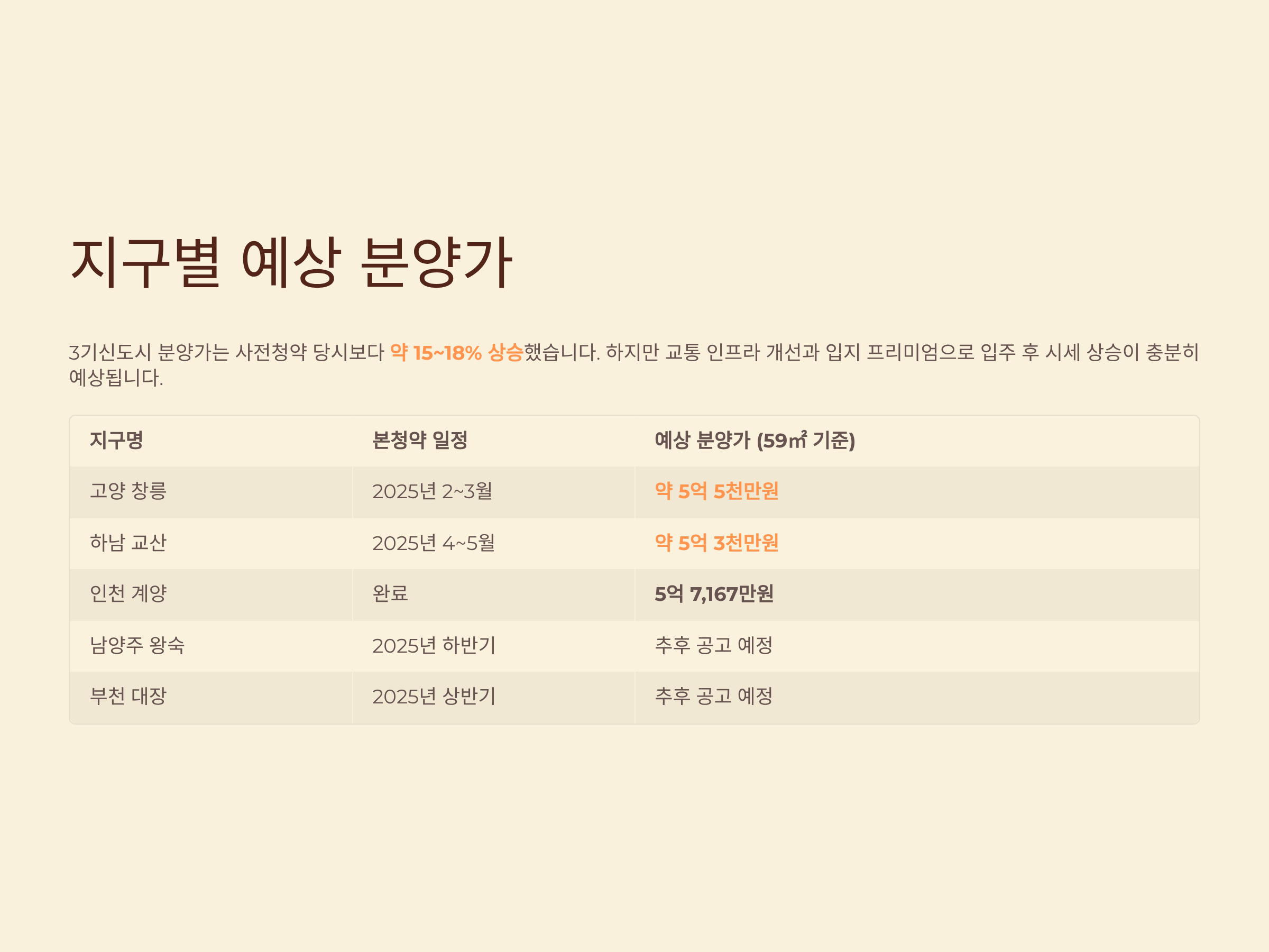 전문가들은 분양가 상승에도 불구하고 시세차익이 충분히 매력적이라고 분석합니다. 교통 인프라 개선과 입지 프리미엄으로 입주 후 시세 상승이 예상되기 때문입니다. 아래 표에서 주요 지구별 분양가를 확인하세요.