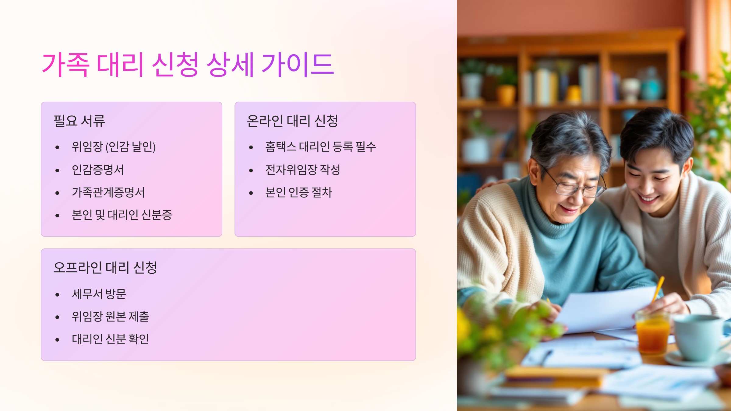 가족이 대신하려면 위임장이 필요하고, 주민등록증과 가족관계증명서를 함께 제출해야 해요. 온라인 신청 시에도 공동 인증서 또는 가족 인증서를 활용하면 가능하답니다.