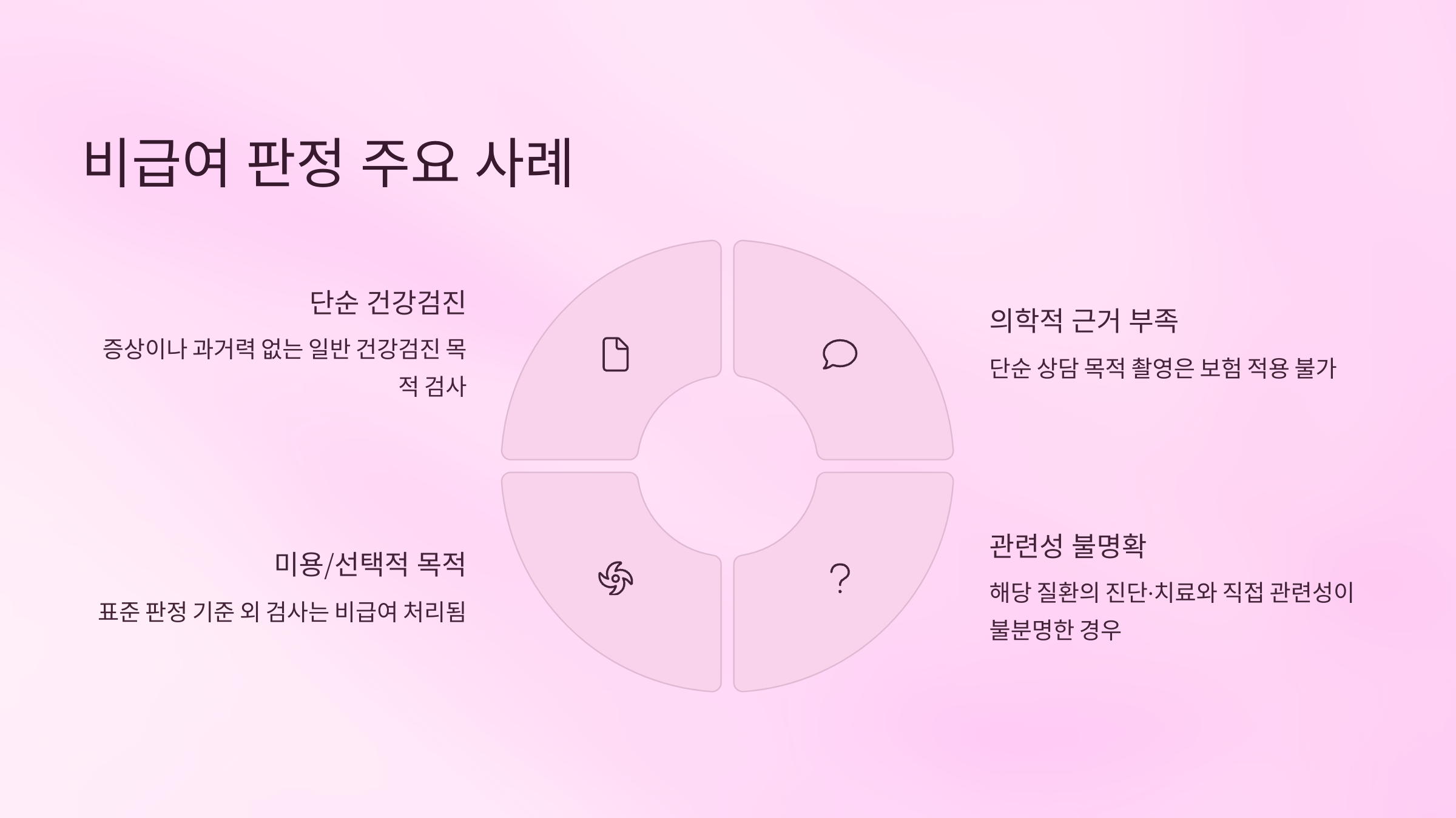 예를 들어, 직장에서 건강검진 항목에 포함된 MRI 검사는 질병 치료 목적이 아니라 단순한 확인 목적이기 때문에 실손보험에서도 비급여로 분류돼요. 또한 환자가 ‘불안해서’ 요청한 검사 역시 해당되지 않아요.