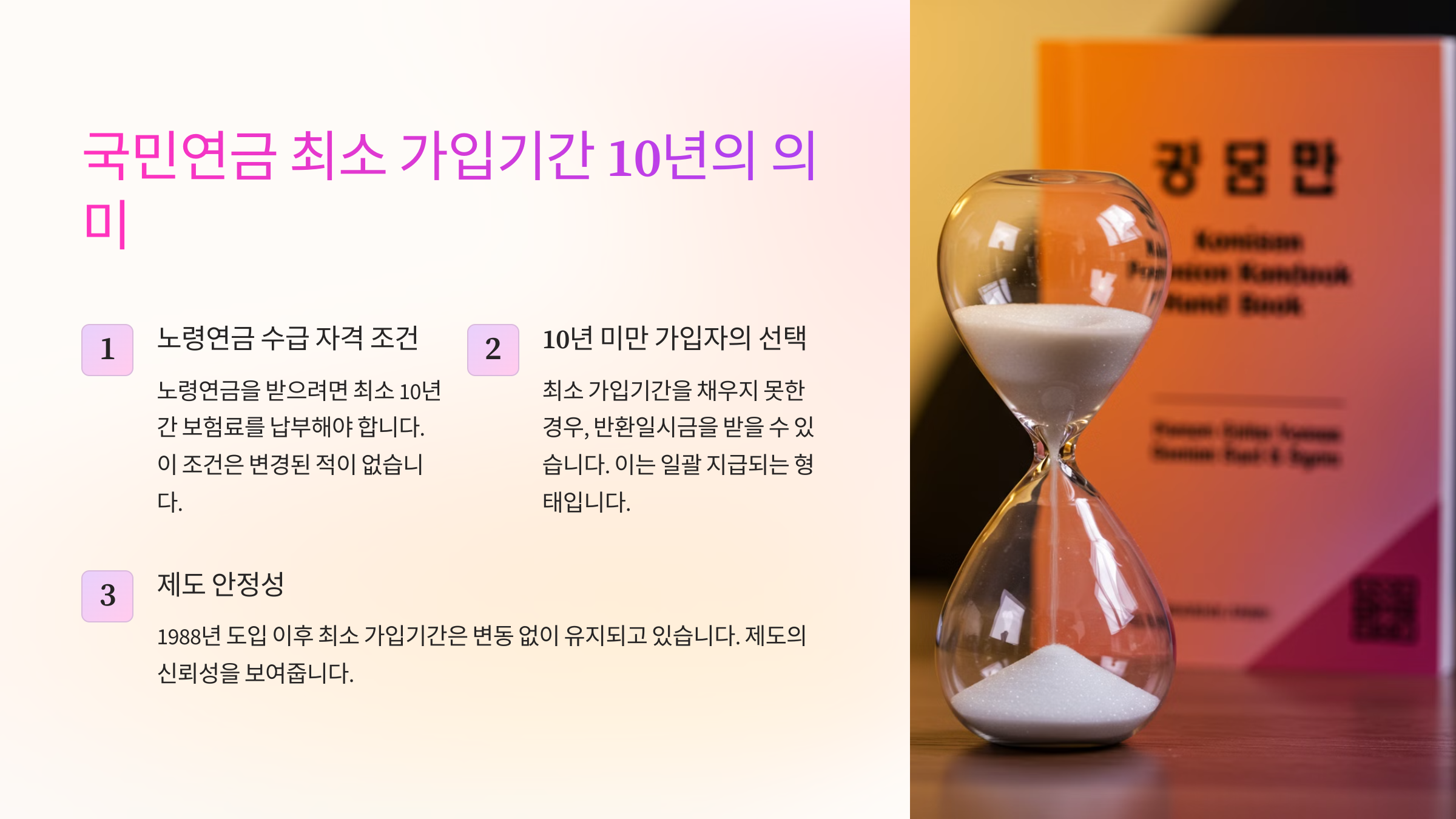 국민연금은 대한민국에서 가장 기본적인 노후 보장 제도예요. 하지만 모든 사람이 국민연금을 받을 수 있는 것은 아니에요. 연금을 받기 위해서는 일정 기간 이상 가입해야 하는데, 그 최소 기준이 바로 10년이에요.