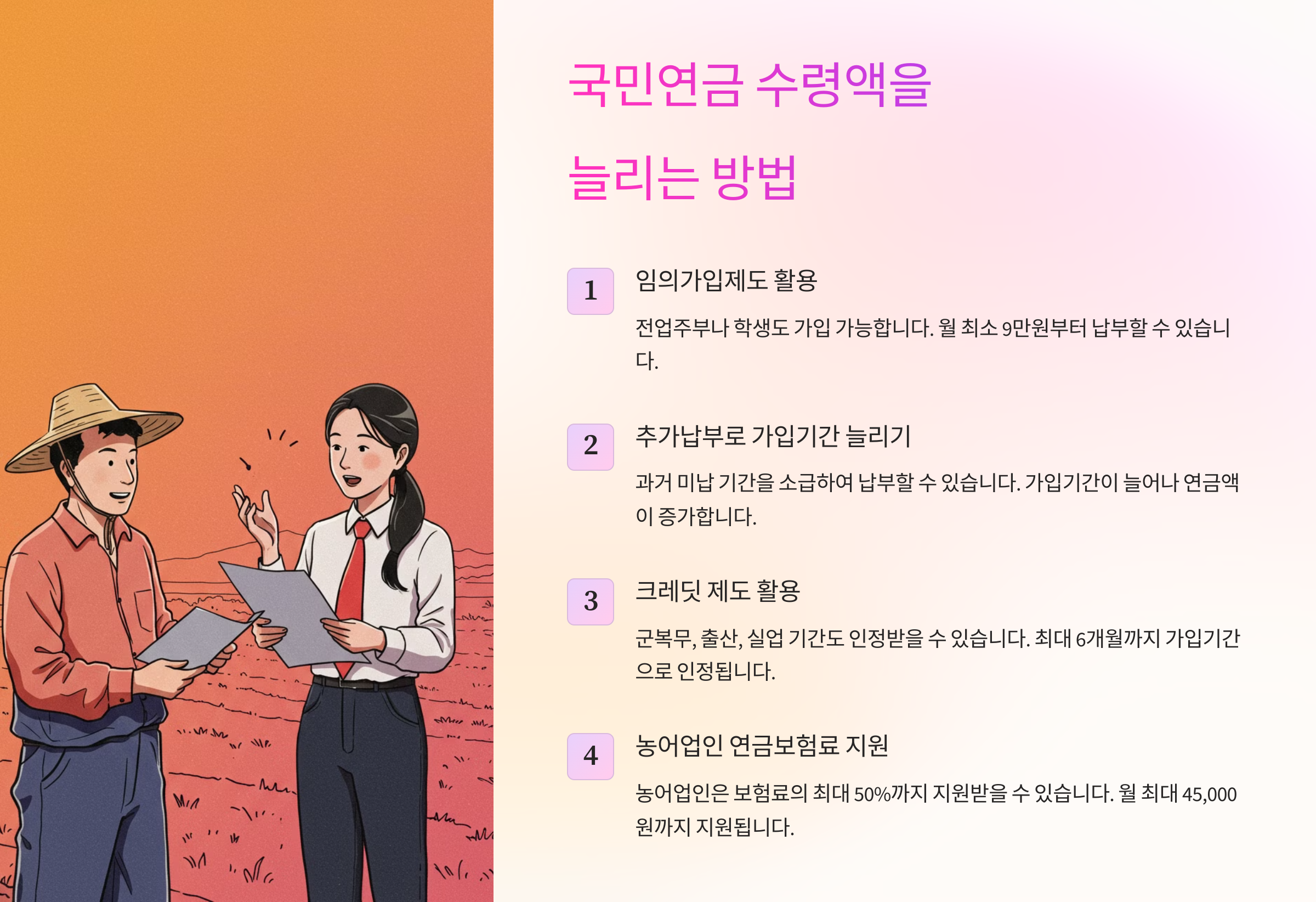 조기수령과 연기수령을 비교해봤다면, 이제 국민연금 수령액을 늘리는 방법을 알아볼게요! 🚀