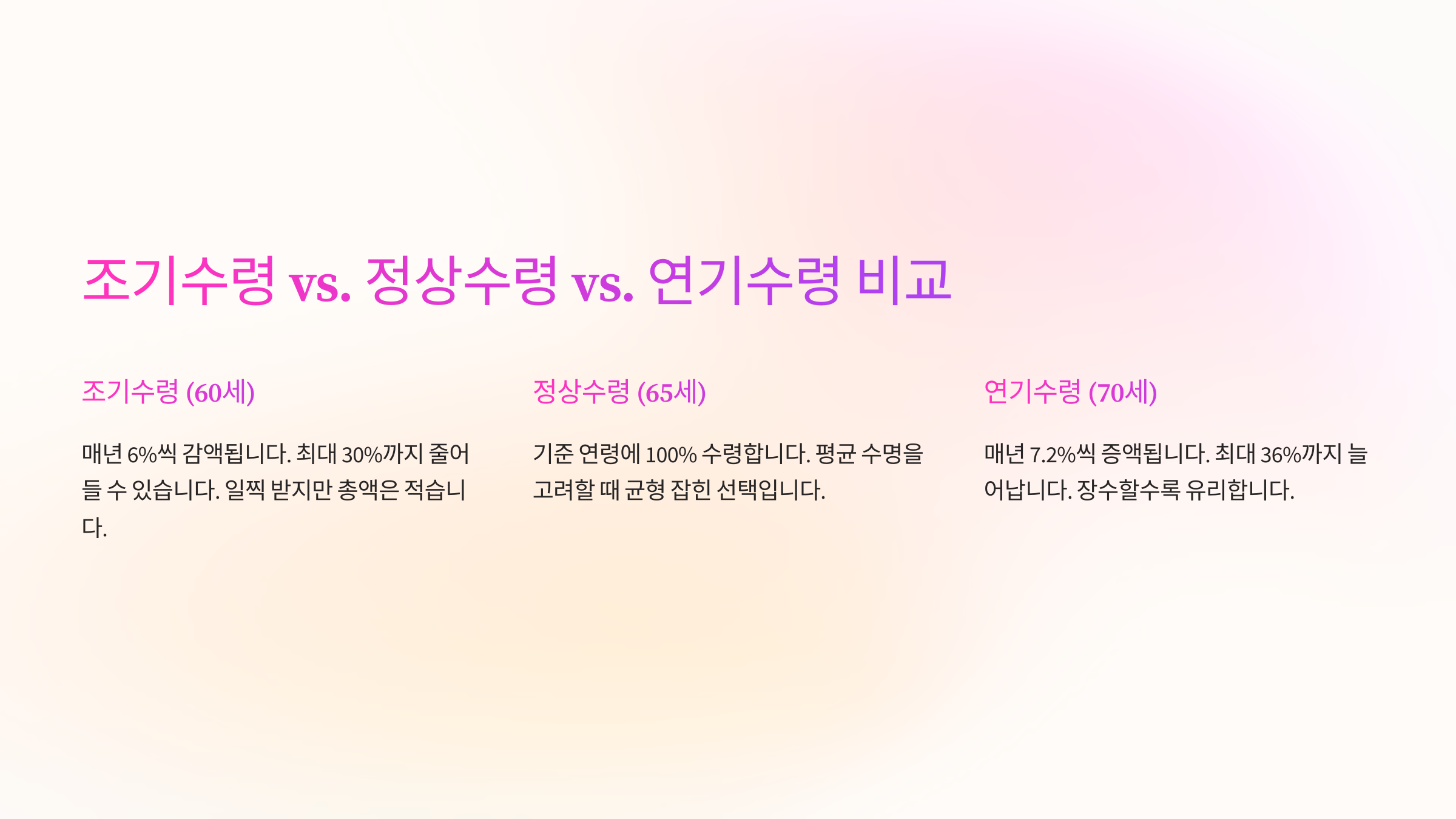 - 연기수령: 만 70세까지 가능 (매년 7.2%씩 최대 36% 증가)