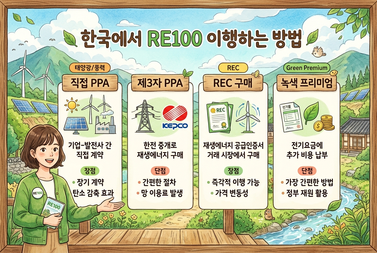 국내에서는 한국에너지공단 기업 재생에너지 지원센터를 중심으로 이행수단이 안내돼요. 대표적으로 REC 구매, 직접 PPA, 제3자 PPA, 녹색 프리미엄, 자가발전 방식이 있습니다.
