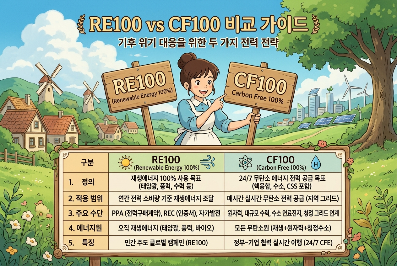 자주 헷갈리는 부분이 바로 RE100과 CF100의 차이예요. RE100은 이름 그대로 재생에너지 전기를 100% 쓰는 개념이고, CF100은 무탄소 전원을 더 넓게 보는 접근으로 설명됩니다.