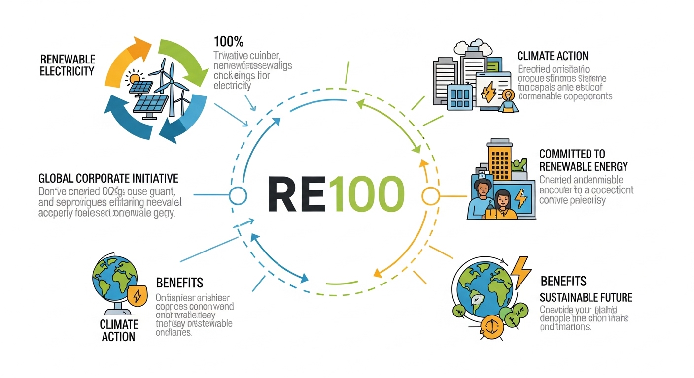 RE100은 기업이 일정한 목표연도까지 자사 전력 사용량을 100% 재생에너지 전력으로 전환하겠다고 공개 약속하는 글로벌 이니셔티브예요. 보통 태양광, 풍력 등으로 생산된 전기를 직접 쓰거나, 구매계약과 인증서를 통해 사용 실적을 인정받습니다.