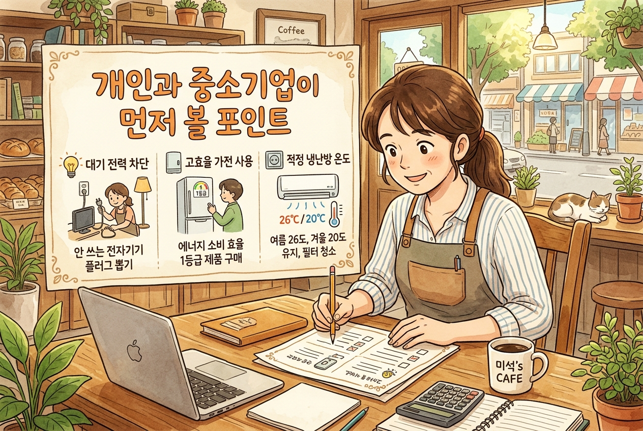 개인은 RE100에 직접 가입하는 대상이 아니지만, 취업이나 투자, 소비에서 기업의 에너지 전환 수준을 보는 기준으로 활용할 수 있어요. 중소기업이라면 당장 100% 전환보다 전기 사용량 파악, 거래처 요구 확인, 정부 제도 체크부터 시작하면 됩니다.