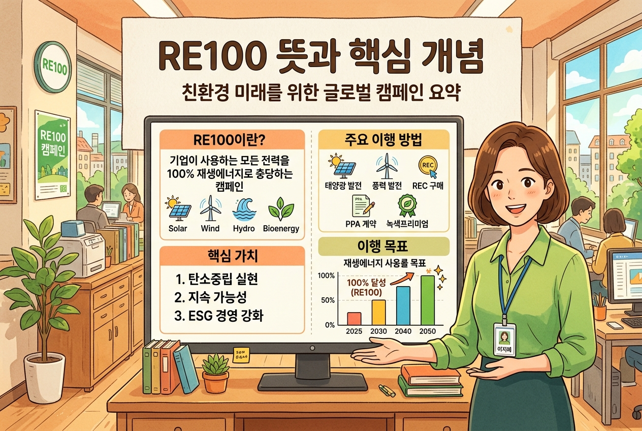 🚀 결론부터 말하면: RE100은 기업이 쓰는 전력을 100% 재생에너지로 전환하겠다는 국제 캠페인입니다.