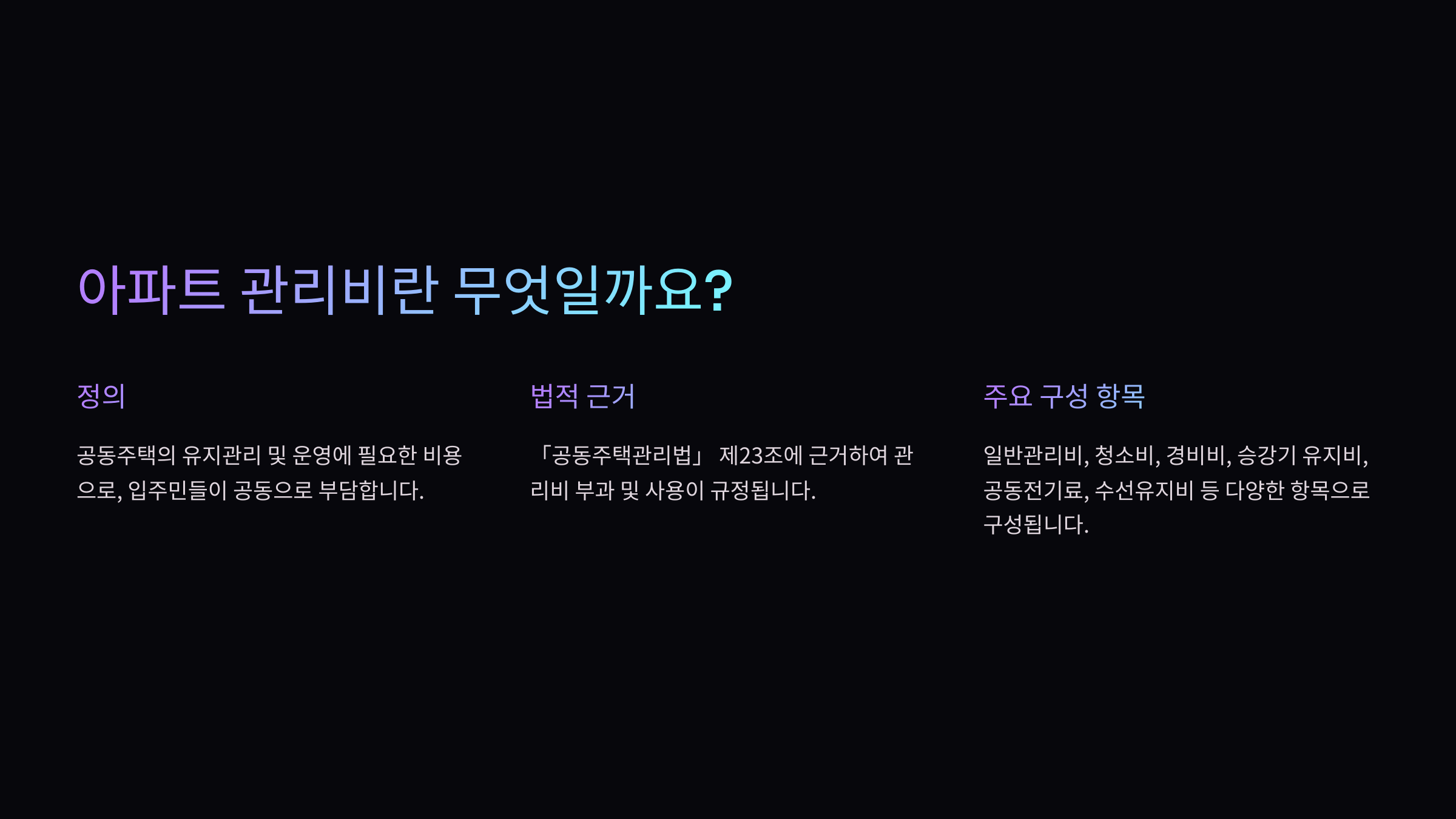 | 공용관리비 | 청소비, 경비비, 공용 전기·수도 요금 등 |