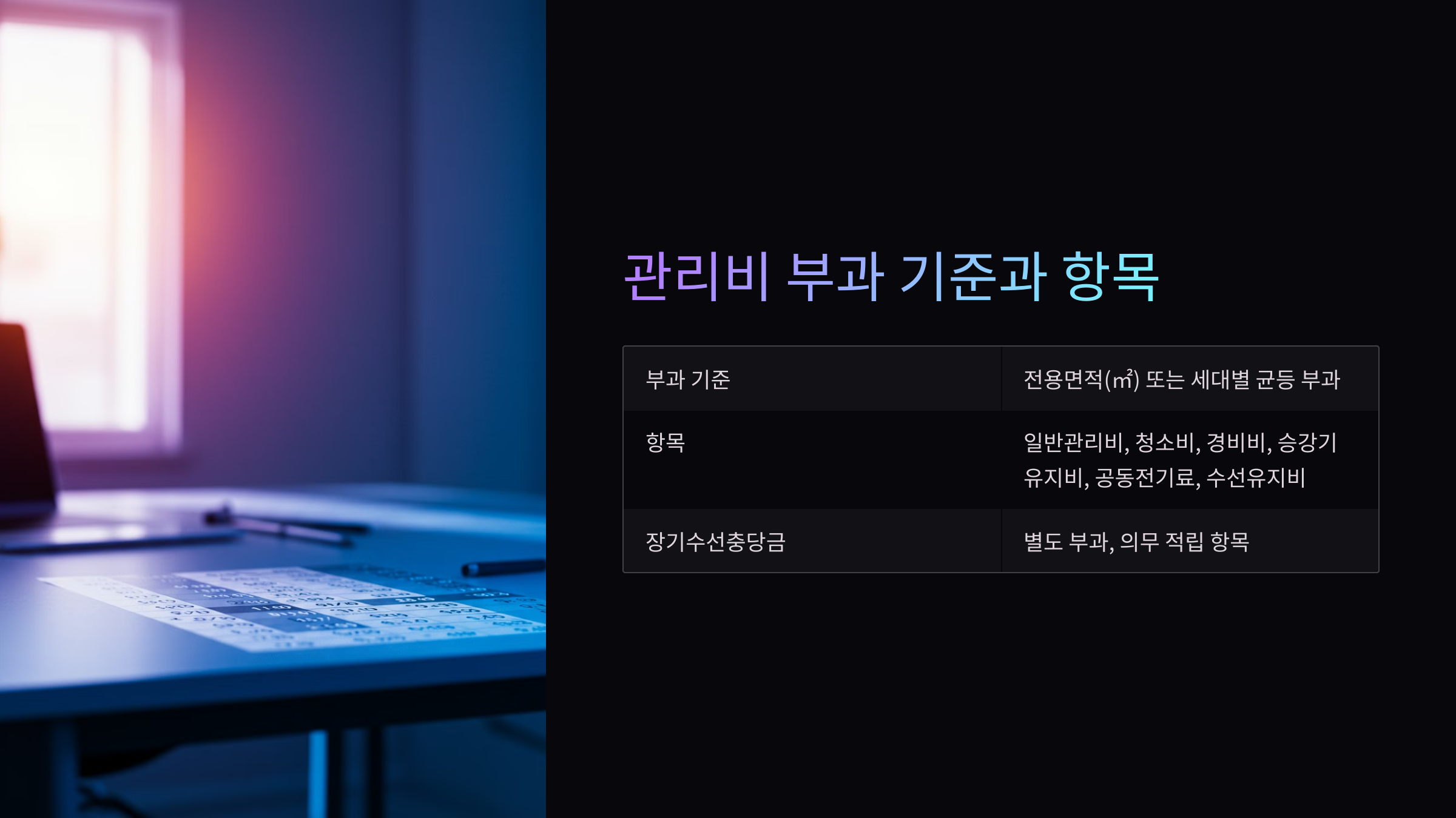 - 공용면적 분담: 승강기, 복도, 주차장 유지 비용