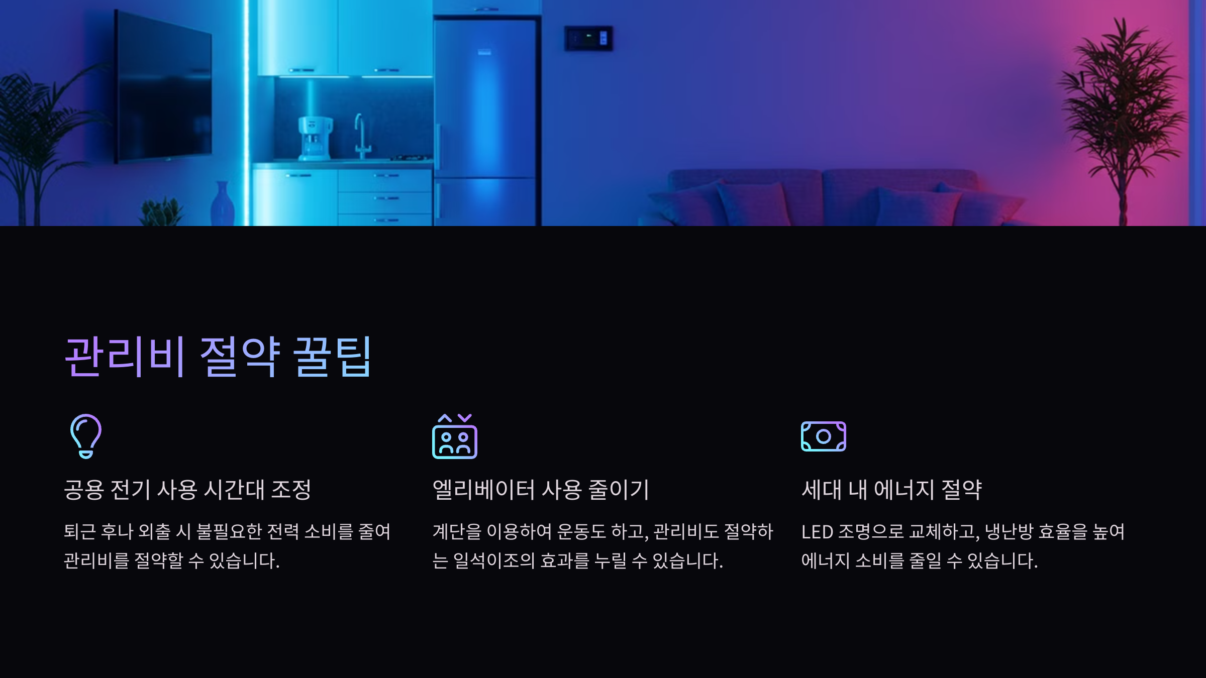 - 공용시설 이용 절약 (엘리베이터, 주차장 조명 등)