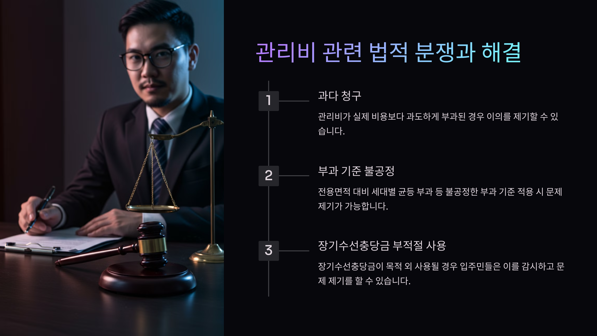 - 공용관리비 부정 사용: 경비·청소비 등을 투명하게 운영하지 않는 경우