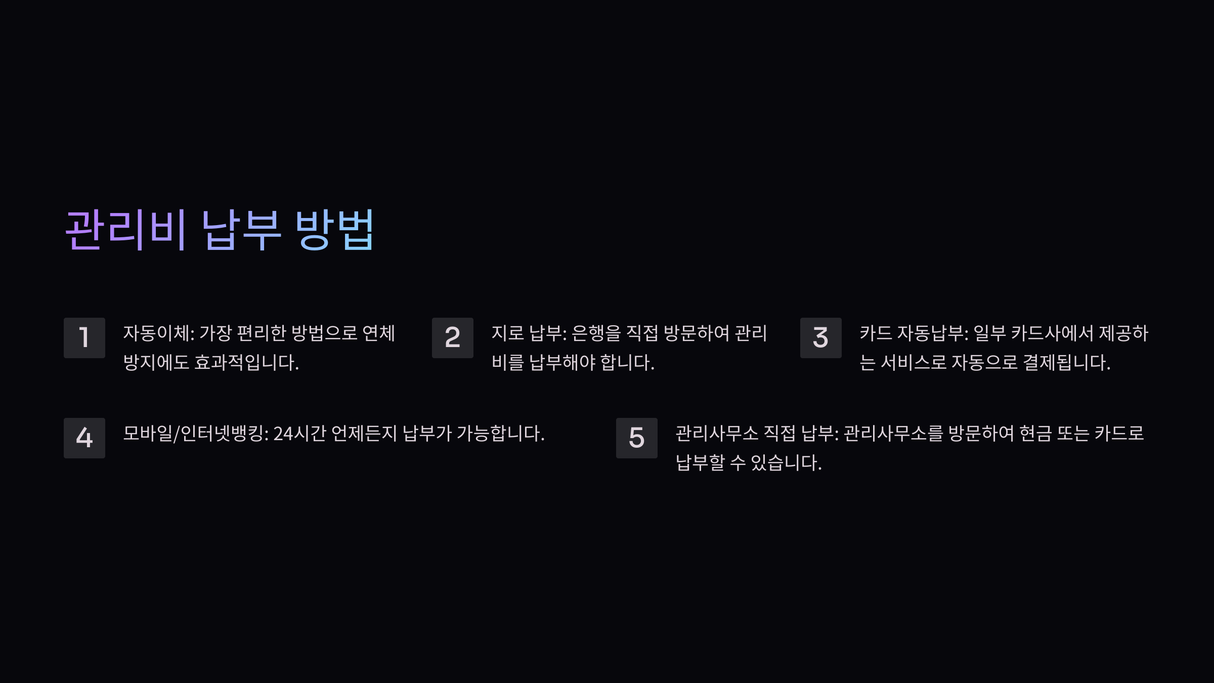 | 자동이체 | 은행 계좌에서 자동으로 관리비 납부 | 연체 방지, 일부 할인 혜택 | 계좌 잔액 부족 시 납부 실패 |